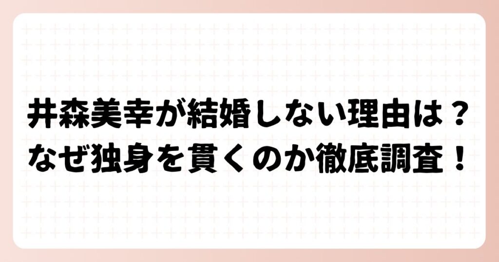 タレントとして長年活躍する井森美幸さん。 明るいキャラクターで人気の井森美幸さんですが、結婚しない理由は何なのか、なぜ独身を貫くのか気になりますよね。 今回は、井森美幸さんが結婚しない理由について詳しく調べてみました! 井森美幸が結婚しない... -