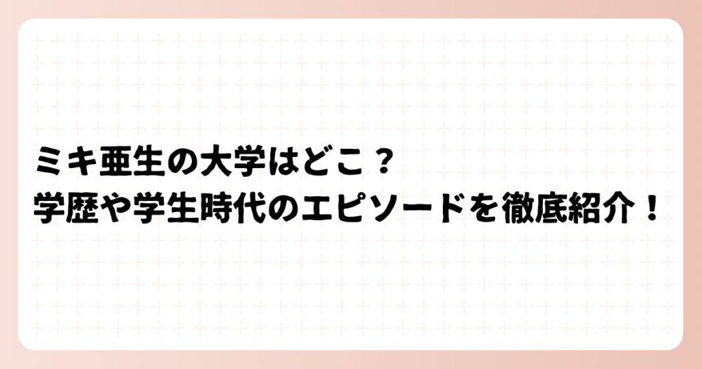 お笑いコンビ・ミキのボケ担当として活躍する亜生さん。 独特のキャラクターで人気の亜生さんですが、大学はどこで、学歴や学生時代のエピソードはどのようなものなのか気になりますよね。 今回は、ミキ亜生さんの大学について詳しく調べてみました! ミキ... -