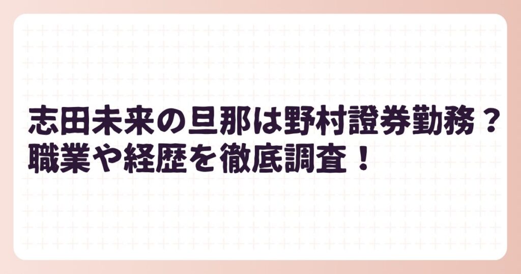 子役時代から活躍し、現在も女優として活動している志田未来さん。 2018年に一般男性と結婚したことを発表し、話題となりましたよね。 そんな志田未来さんの旦那さんについて、野村證券に勤務しているという噂がネット上で広まっているようです。 この記事... -