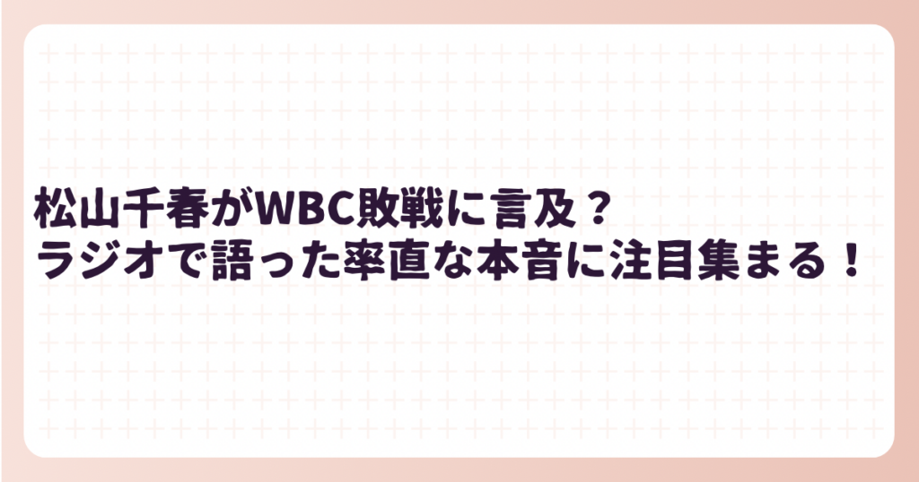 フォークシンガーの松山千春さんが、ワールド・ベースボール・クラシックで敗退した侍ジャパンについてラジオで本音を語り、注目を集めています。 自身がパーソナリティーを務める番組の中で、試合を振り返りながら率直な思いを語った松山千春さん。 その... -
