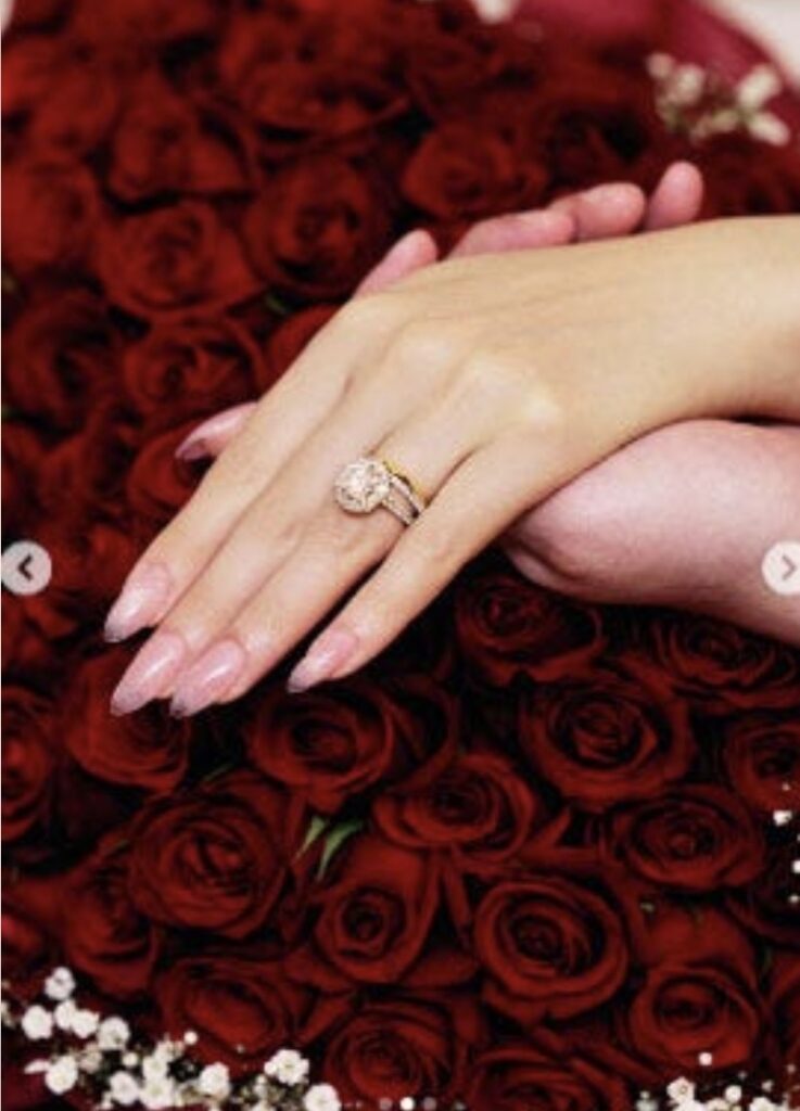 同時に公開されたのは、左手薬指に輝く大きなダイヤモンドの指輪の写真です。