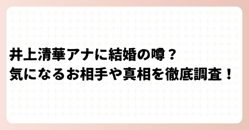 『めざましテレビ』のメインキャスターとして活躍する井上清華さん。 そんな井上清華さんですが、結婚の噂があるようです。果たして本当なのでしょうか。 今回は、井上清華さんの結婚に関する噂や、気になるお相手、そして真相について詳しく解説していき... -