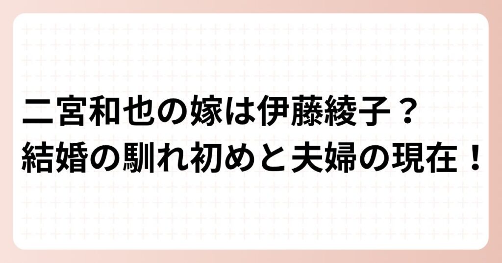 人気アイドルグループ「嵐」のメンバーとして活躍する二宮和也さん。 そんな二宮和也さんですが、お嫁さんはどのような方なのでしょうか? 今回は、二宮和也さんのお嫁さんである伊藤綾子さんについて、結婚の馴れ初めと夫婦の現在を詳しく紹介します。 二... -