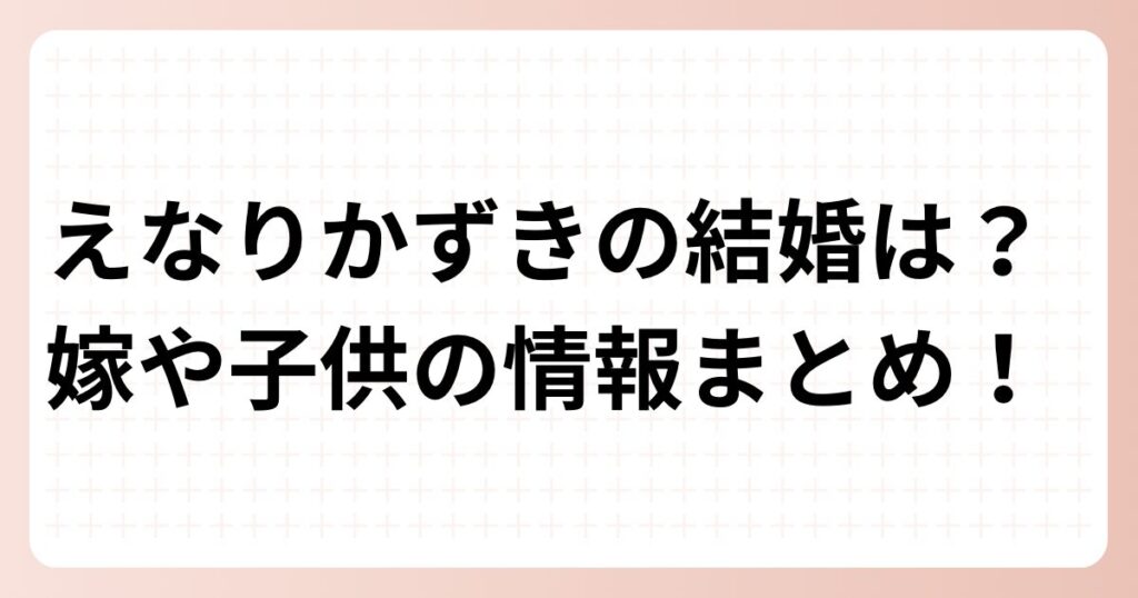 子役時代から活躍し、現在も幅広い分野で活動するえなりかずきさん。 そんなえなりかずきさんですが、結婚はしているのでしょうか? 今回は、えなりかずきさんの結婚に関する情報や、嫁、子供の有無について詳しく解説していきます。 えなりかずきさんの結... -