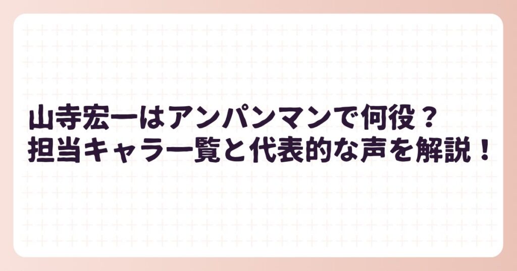 「七色の声を持つ男」として知られる声優の山寺宏一さん。 数々のアニメやゲームで活躍し、その演技力は業界でも高く評価されています。 そんな山寺宏一さんですが、「それいけ!アンパンマン」では何役を担当しているのでしょうか? そこで今回は、山寺宏... -