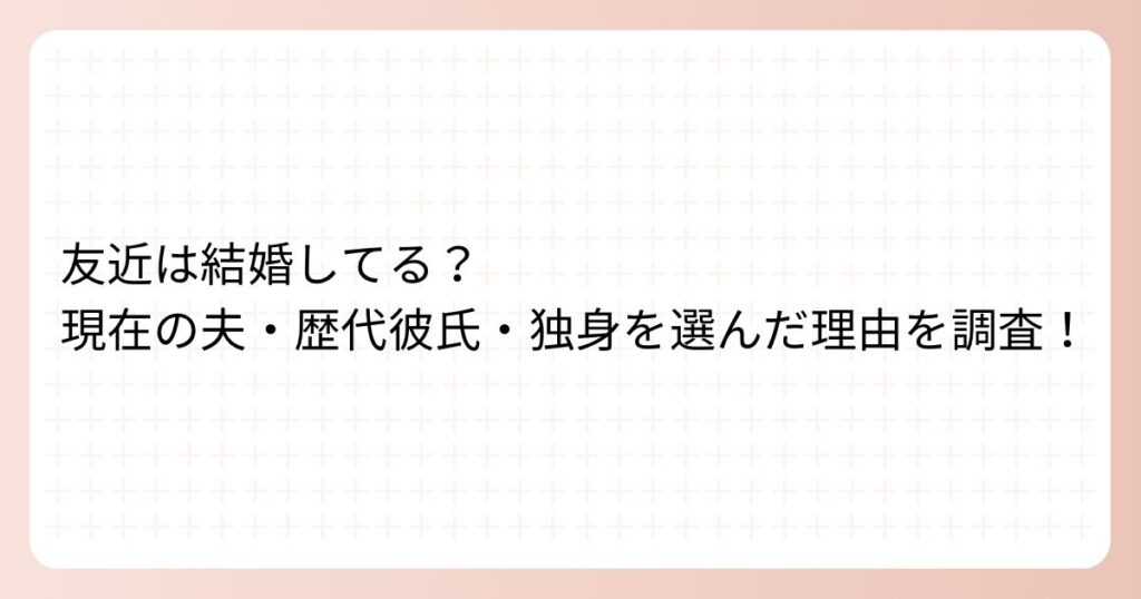 多才な芸人として活躍する友近さん。 そんな友近さんですが、結婚しているのでしょうか? また、これまでの恋愛遍歴や独身を選んだ理由はどのようなものなのでしょうか? 友近さんの結婚に関する状況について、これまでの経緯や現在のお考えを詳しく調べて... -