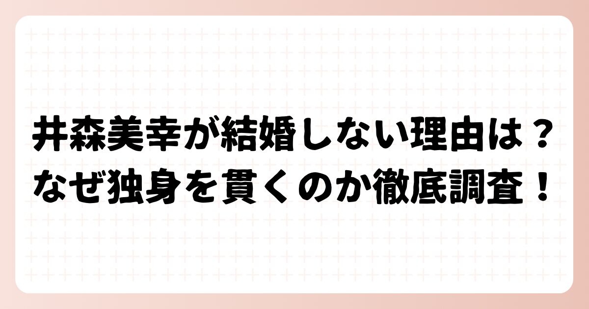 井森美幸さんが結婚しない理由は、本人の「自由」を重んじる価値観が根本にあり、それに「結婚への消極性」や「潔癖症」といった性格、さらに「仕事への充実」などの環境が複合的に関係していると考えられます。